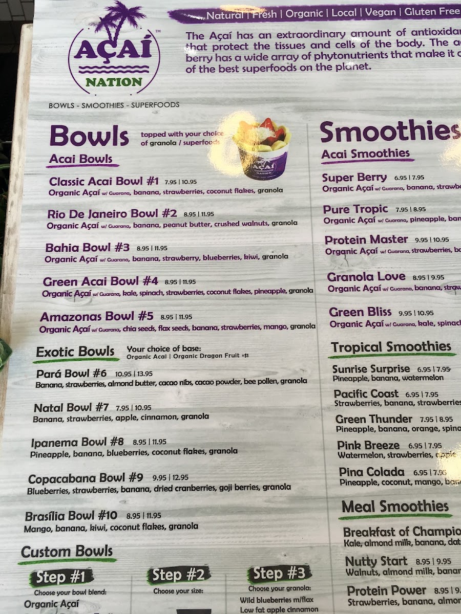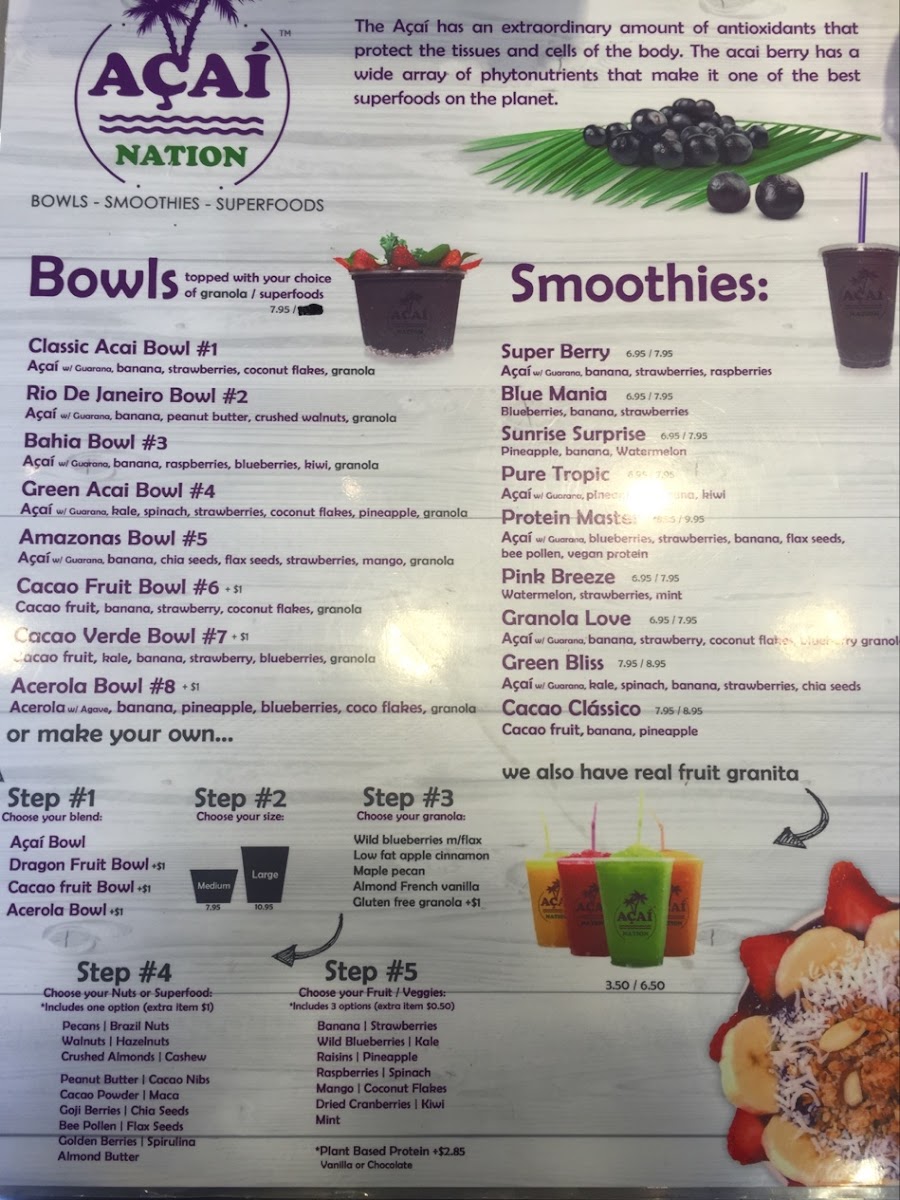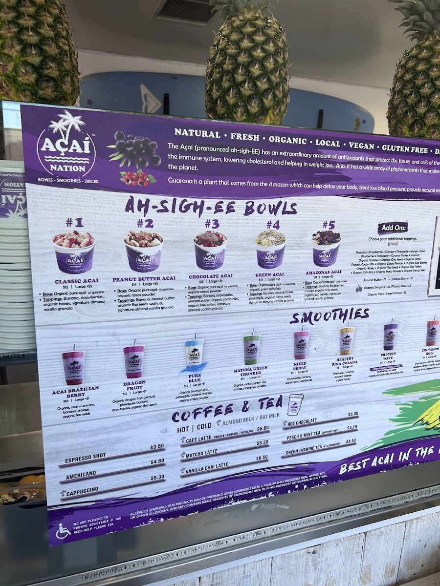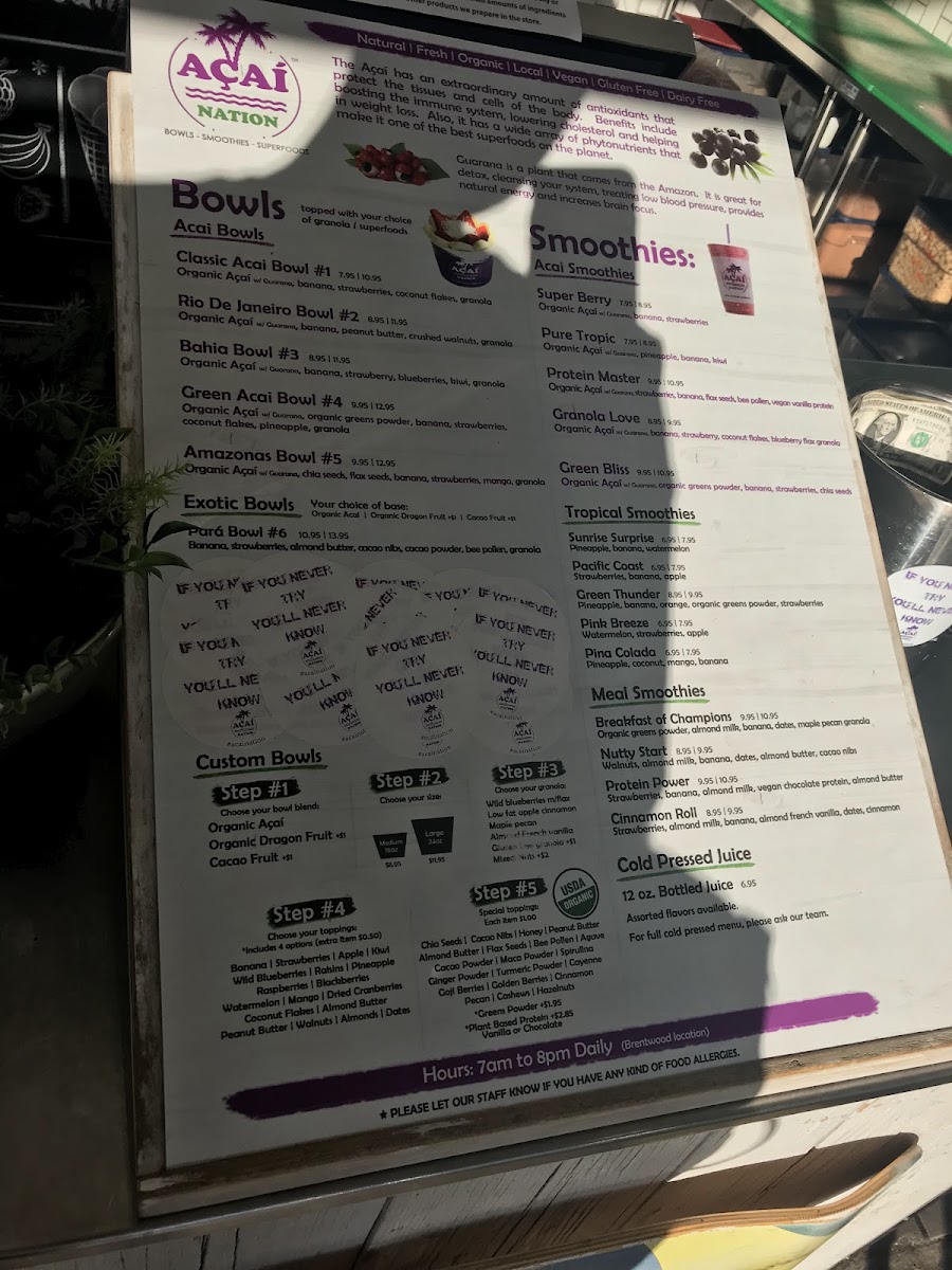 From a reviewer’s perspective, the menu at Acai Nation at 11740 San Vicente Blvd offers a vibrant array of choices that cater to both health-conscious diners and those seeking indulgent flavors. Their Custom Bowls, available in 16 Oz. and 24 Oz., allow guests to craft their own combinations, making each visit highly personalized. For beverage lovers, the Coffee & Tea selection includes classics like Americano, Espresso Shot, Matcha Latte, and Hot Chocolate, alongside soothing options such as TEA - Chamomile. The Healthy Drinks lineup features refreshing staples like FIji Water 500mL, Yerba Mate, and BloomVita Coco, perfect for hydration on the go. Smoothie enthusiasts can enjoy inventive blends such as Matcha Green Thunder, Cinnamon Roll, Sweet Kale, Healthy Pina Colada, and Chocolate Chocolate, each offering a balance of taste and nutrients. Of course, the acai bowls remain the star, with tempting options like Chocolate Acai Bowl #3, Classic Acai Bowl #1, Green Acai Bowl #4, Just Acai Base, and Amazonas Bowl #5, all customizable with delightful Toppings/Sides like Peanut Butter and Almond Butter. Overall, the menu strikes a harmonious balance between wholesome health foods and flavorful treats, making it easy to find something satisfying for every palate.