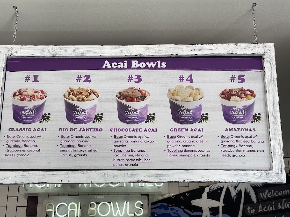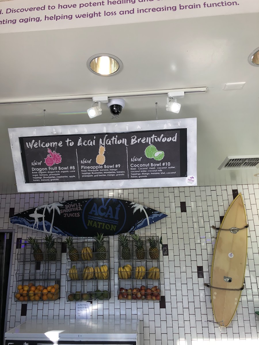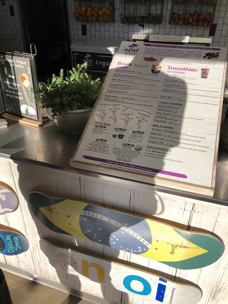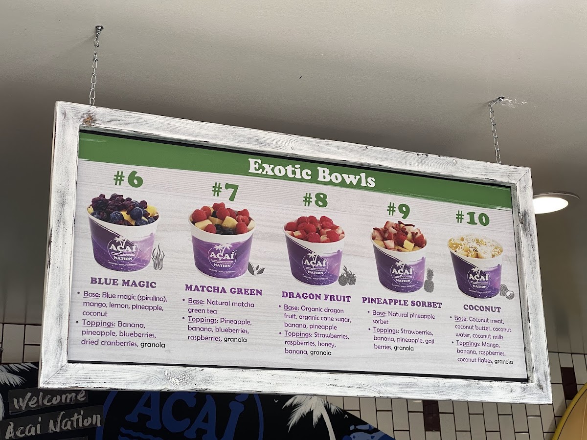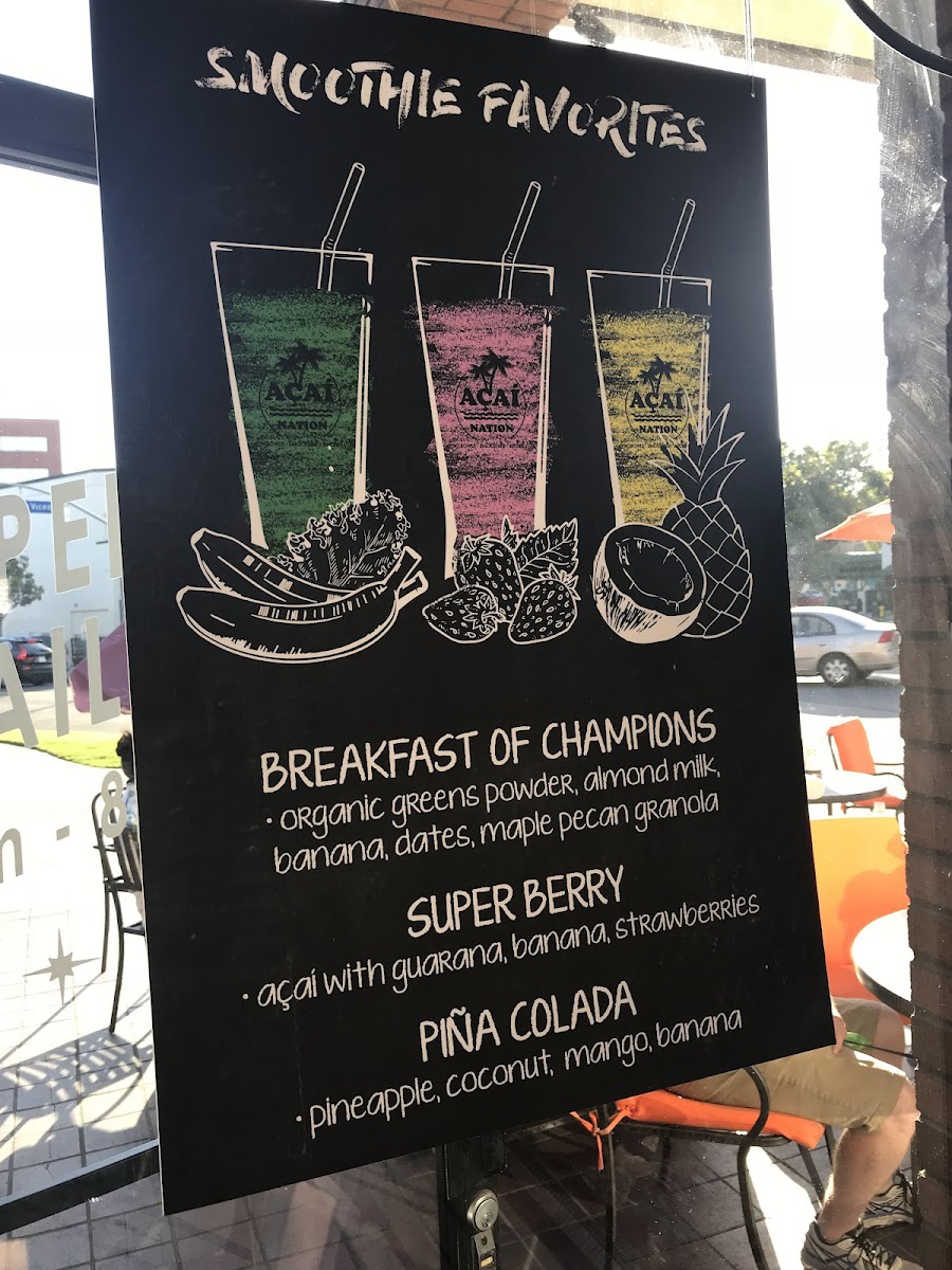 From a reviewer’s perspective, the menu at Acai Nation at 11740 San Vicente Blvd offers a vibrant array of choices that cater to both health-conscious diners and those seeking indulgent flavors. Their Custom Bowls, available in 16 Oz. and 24 Oz., allow guests to craft their own combinations, making each visit highly personalized. For beverage lovers, the Coffee & Tea selection includes classics like Americano, Espresso Shot, Matcha Latte, and Hot Chocolate, alongside soothing options such as TEA - Chamomile. The Healthy Drinks lineup features refreshing staples like FIji Water 500mL, Yerba Mate, and BloomVita Coco, perfect for hydration on the go. Smoothie enthusiasts can enjoy inventive blends such as Matcha Green Thunder, Cinnamon Roll, Sweet Kale, Healthy Pina Colada, and Chocolate Chocolate, each offering a balance of taste and nutrients. Of course, the acai bowls remain the star, with tempting options like Chocolate Acai Bowl #3, Classic Acai Bowl #1, Green Acai Bowl #4, Just Acai Base, and Amazonas Bowl #5, all customizable with delightful Toppings/Sides like Peanut Butter and Almond Butter. Overall, the menu strikes a harmonious balance between wholesome health foods and flavorful treats, making it easy to find something satisfying for every palate.
